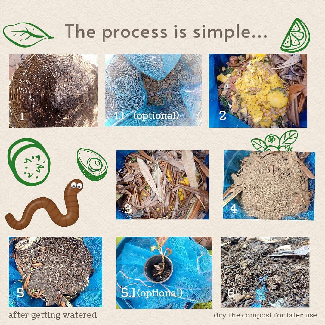 1) On the first day, lay 10-15 cm height of dry leaves at the bottom of the basket, followed by cow manure. Refer to the above ratio for the amount
